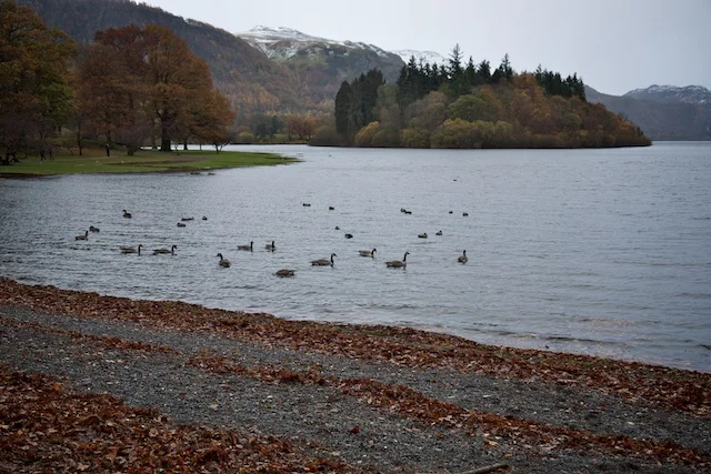 We ventured back out to get see what we could get at the tourist inforation center, then went to walk around Derwentwater, the lake right next to Keswick. There seems to be public foopaths around most of the lake, but we only made it a mile or so before the path was little different than a river. Not surprising, since it had been raining (and was drizziling during our walk), and both the lake and the nearby rivers were very high.