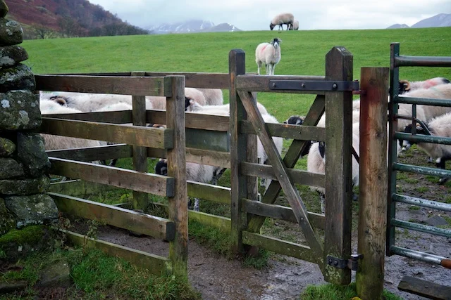 We came across lots of sheep, and the footpath sometimes took us through the same fields as the grazing sheep. Some fences had regular latch gates, others had "kissing gates" (you swing the gate one way, step into a small section, swing the gate the other way, then step out) or "step stile" (steps poke out through the fence's stiles, so you step half-way up, swing your foot to the other side of the fence, then step down). The idea is humans can navigate these gates but sheep can't, but those sheep sure are hopeful. Every time a gate swung closed, all the sheep within earshot would run to the fence, as if they were thinking "Did they leave it open?".