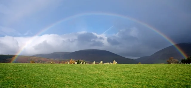 I started working my way around the circle, then noticed that a rainbow was in the sky, which made a great photo subject. But the best was yet to come; a few minutes later we got a full rainbow! I couldn't quite get all the rainbow in a shot, so i started backing up across the field, but still no luck. Not knowing how long it would last, I ran to the fence, but still couldn't fit both sides of the rainbow into the shot, so I ended up taking multiple pictures, knowing I'd be able to stitch them toether later. The result is by far my favorite picture so far of the trip, a full rainbow over the Castlerigg Stone Circle.