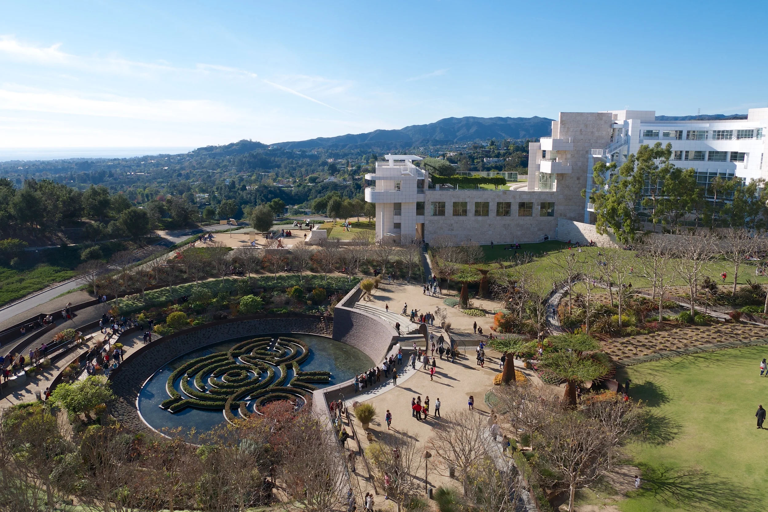 As soon as you exit the garage, there are people directing you into the tram line. There was the expected line of people waiting to board, so we decided to walk the mile up the hill. Before the path, we wandered through the sculpture garden. The sky was deep blue with lots of streaks of white clouds, so Kellen, Noël, and I took lots of photos (which would be ongoing throughout the trip). We also got great views of Los Angeles on the way up.
