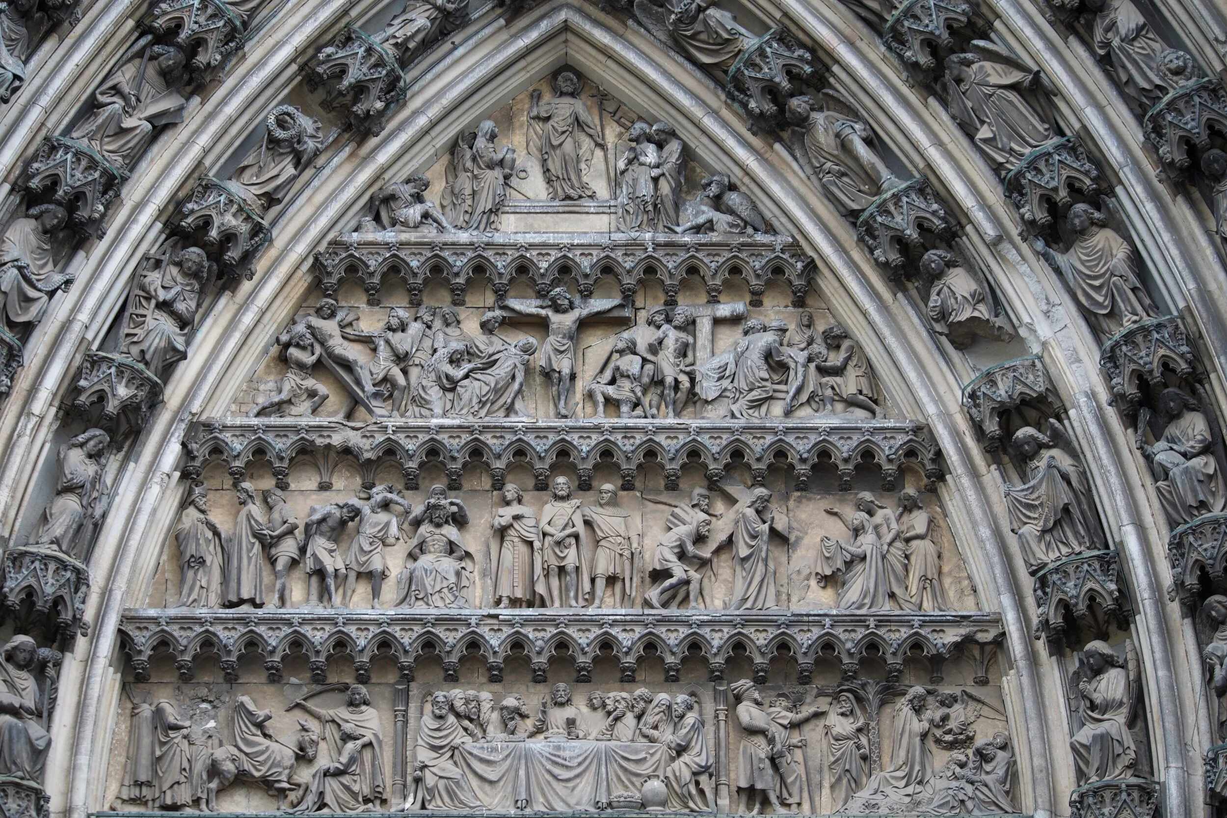 Our tour started at the plaza between the train station and the cathedral. It's certainly an impressive building; we would be touring it later in our visit, but I still took the time to grab a few photos. We continued around the cathedral to Roncalli Square, where there was a Roman arch that had been discovered nearby and relocated there. There was also a life-size replica of a top of one of the cathedral spires. It's very large on its own but looks very small so high up.