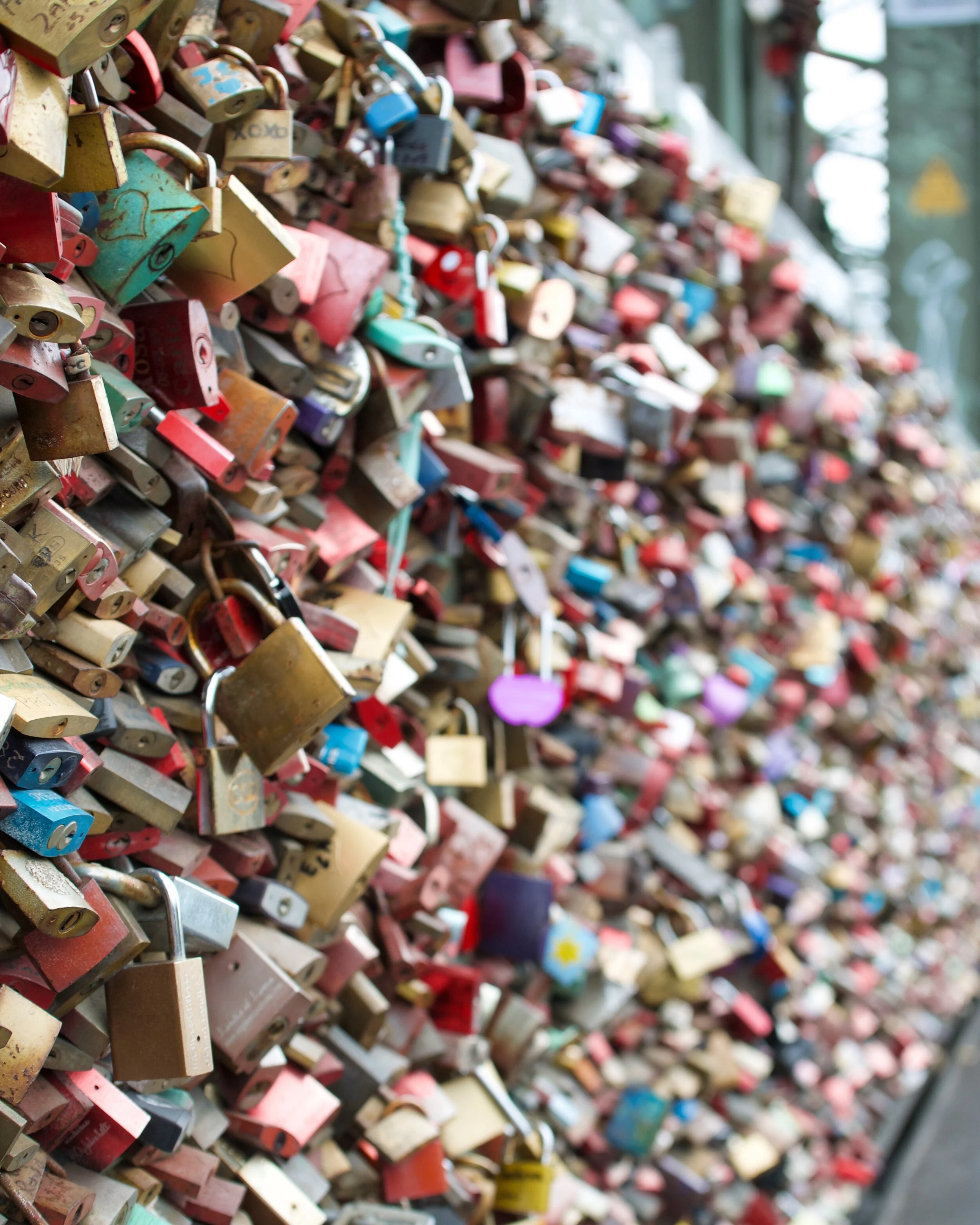 After going back past the Roman-Germanic Museum and Museum Ludwig, we walked up to the Hohenzollern Bridge, which we crossed on our way into town on the train from Frankfurt. At the time we saw a bunch of locks on the bridge, and now on foot, we saw them up close.