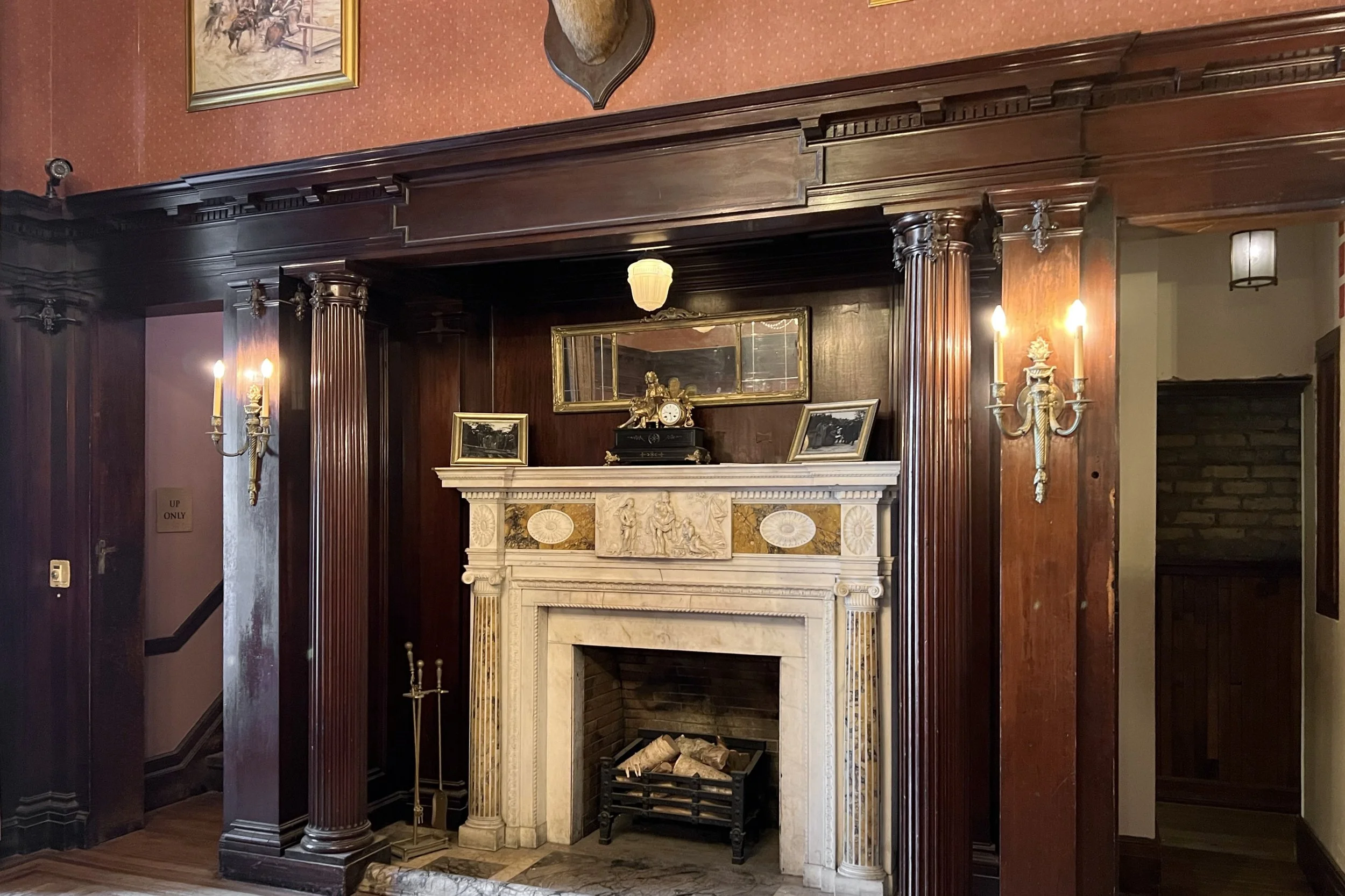 Pellett's study is also on the main floor. It has a fireplace with panels on either side that conceal secret passageways, one to the second floor, and the other to the basement.
